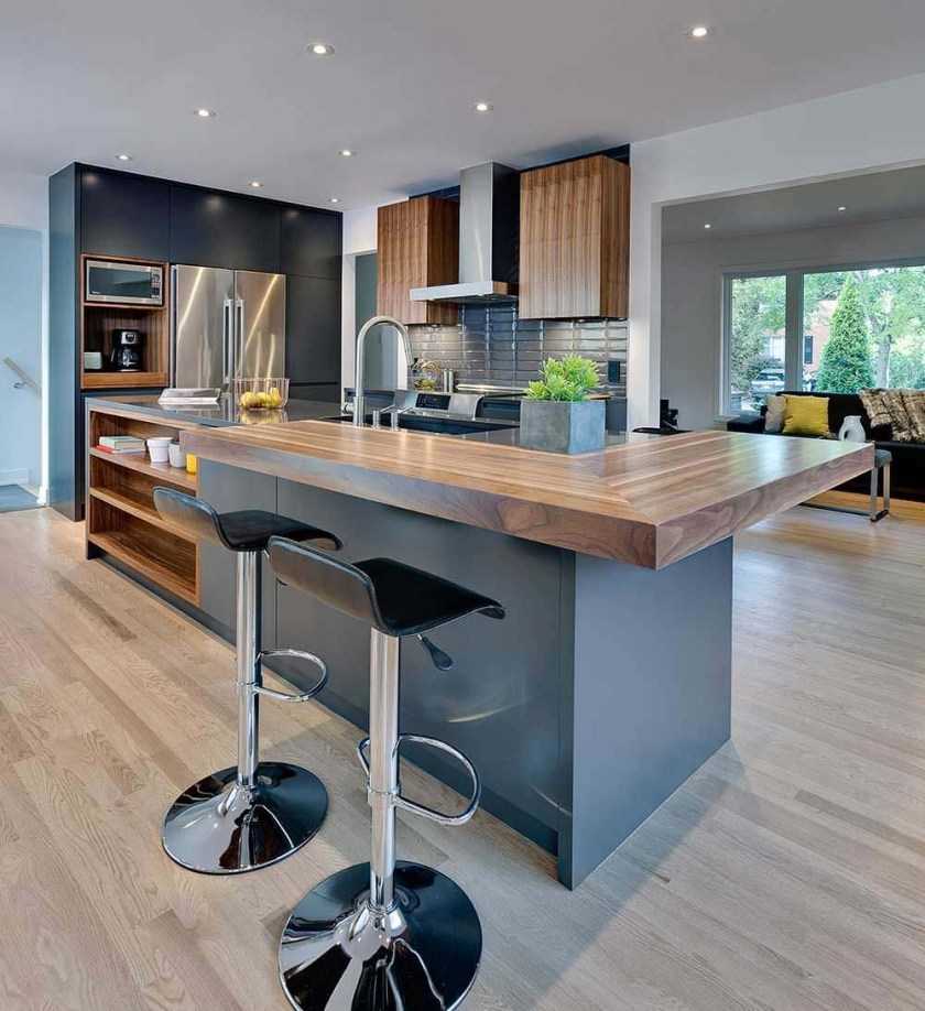Чаще открытая угловая стойка, перпендикулярная основной линии кухни. Высота такой барной стойки как раз +15-20 см. к высоте столешницы. Изготавливают кухонщики. Материал столешницы тот же, что и у кухни.
