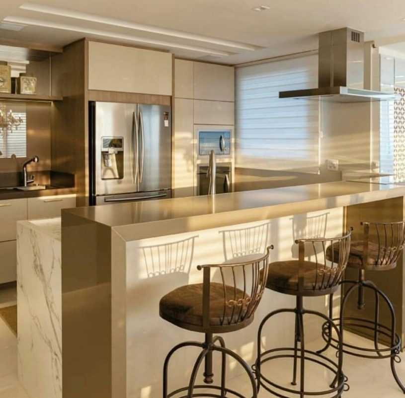 Барная стойка лесенкой на разных уровнях по дизайну отсылает нас к печальным кухням из двухтысячных, но, теоретически, и приемлемый вид она иметь может.
