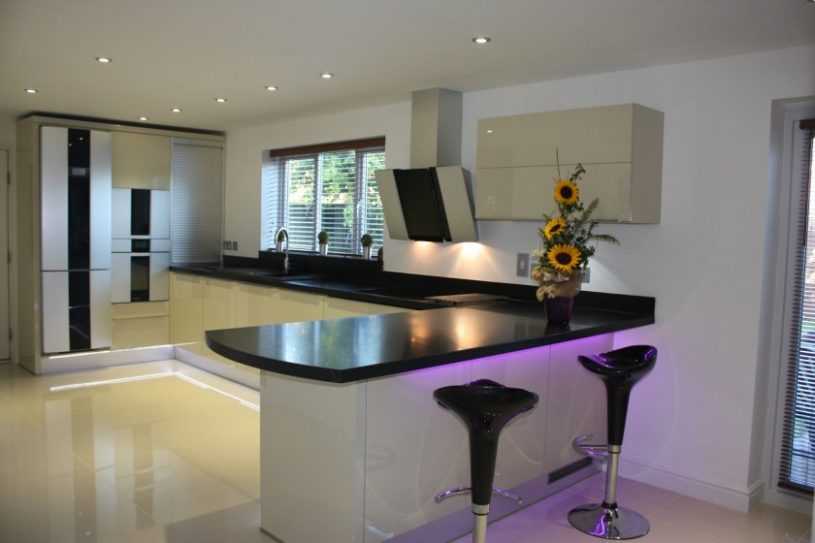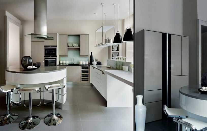 Хай-тек предполагает модели из МДФ, имитирующего дерево с однородной структурой, или отделанные акриловыми плитами. Последний вариант более эффектен. Модели в этом стиле могут иметь криволинейную конфигурацию и радиусные фасады