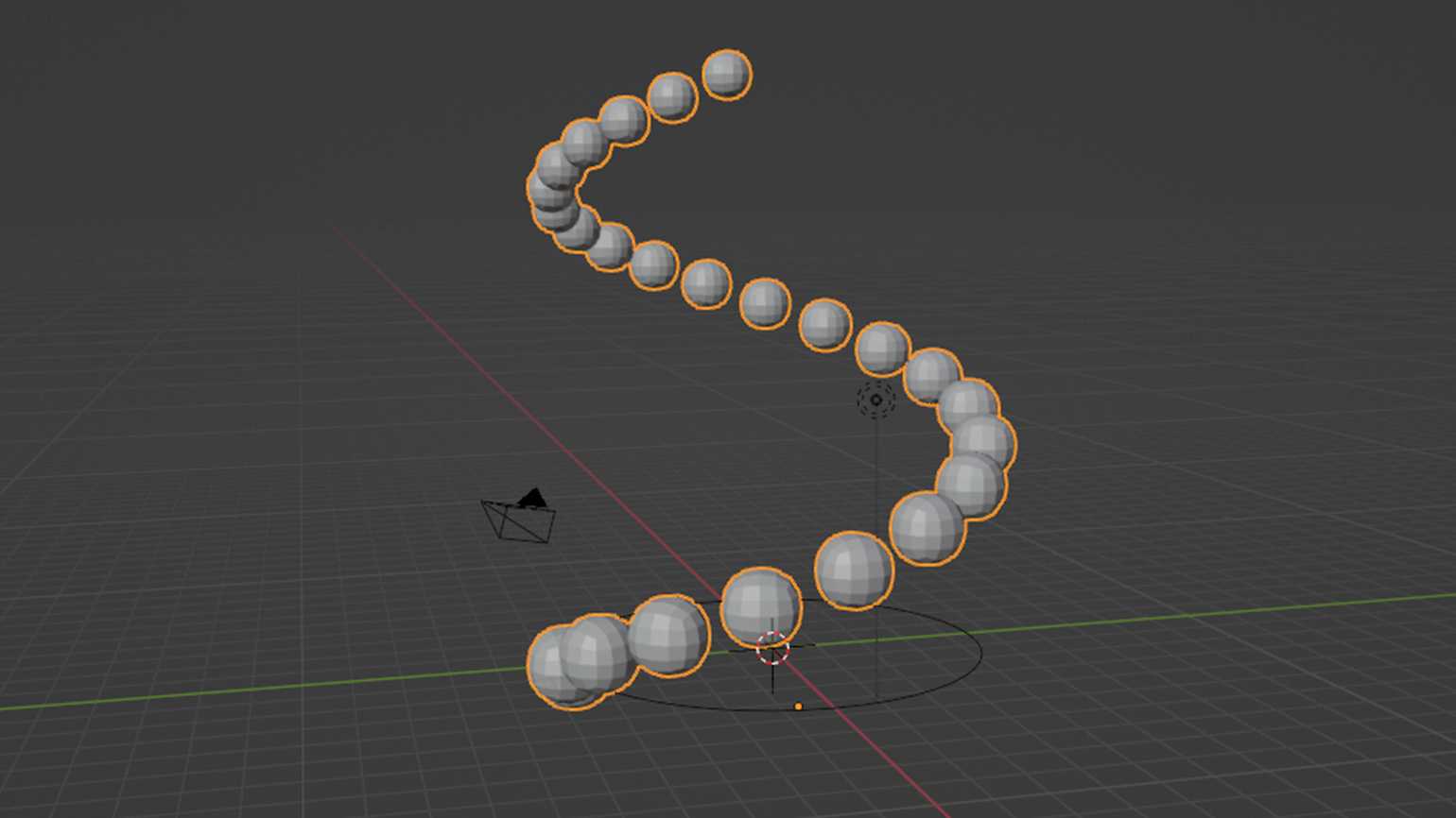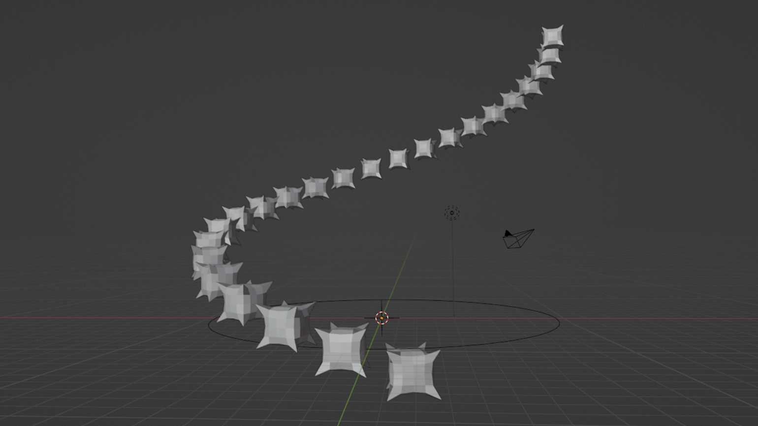 С получившейся цепочкой копий можно поэкспериментировать: через сочетание клавиш G + Z вытянуть спираль и изменить форму объектов с помощью вращения (R) или масштабирования (S).