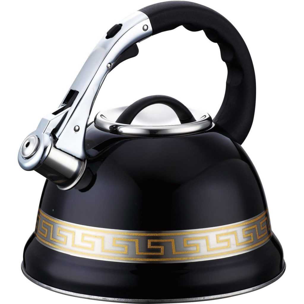 Оснащен свистком и поворотной термоизолированной ручкой, материалом изготовления которой служит пластик.