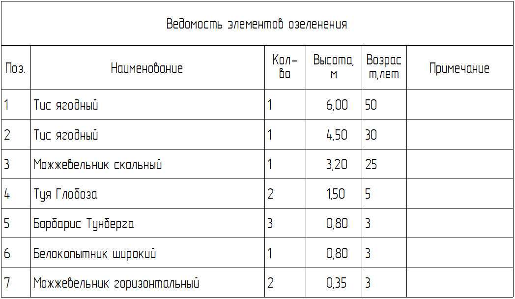 На посадочных планах не нужна подробная детализация символов растений. Растения одного вида связывают цепочкой. Делают выноску с позицией в посадочной ведомости и количеством растений. Изображения деревьев заменяют на окружность диаметром 2,5 мм.
