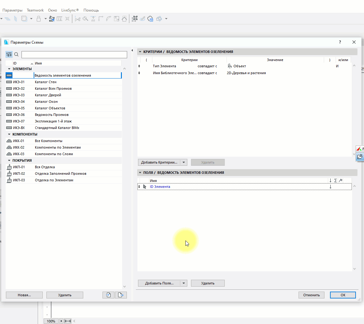 Создаем новый каталог в меню «Параметры Схемы». В критериях для выборки задаем «Тип Элемента» – «Объект». А также добавляем дополнительный критерий – «Имя Библиотечного Элемента». В поле значение вводим имя объекта «2D-Деревья и растения».