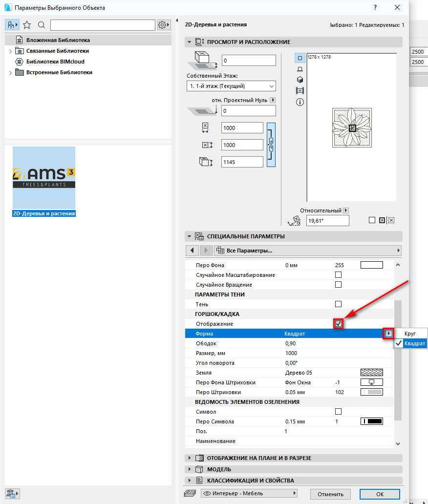 - ГОРШОК/КАДКА. Можно включить отображения горшка круглой или квадратной формы.