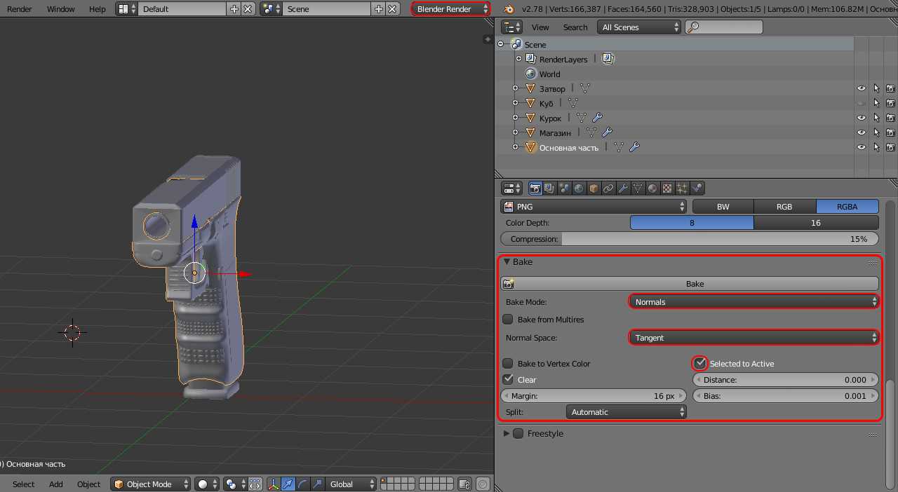 При создании High-Poly модели нет необходимости экономить полигоны, используйте столько, сколько считаете нужным. Не жалейте полигонов на всеразличные мелкие детали и порезы. Для удобства вы можете использовать Hotkeys (горячие клавиши), которые сильно упростят вам жизнь и сэкономят уйму времени. Все полезные горячие клавиши Blender написаны в этой статье: Горячие клавиши Blender3D. Нам же понадобятся только некоторые из них: E — экструдирование, G — перемещение, S — масштабирование, Ctrl+B — фаска, Z — переход в режим Wireframe, X — удаление, A — выделение всех элементов, если нажать A в режиме редактирования, то выделятся все точки/ребра/плоскости, H — скрыть объект.