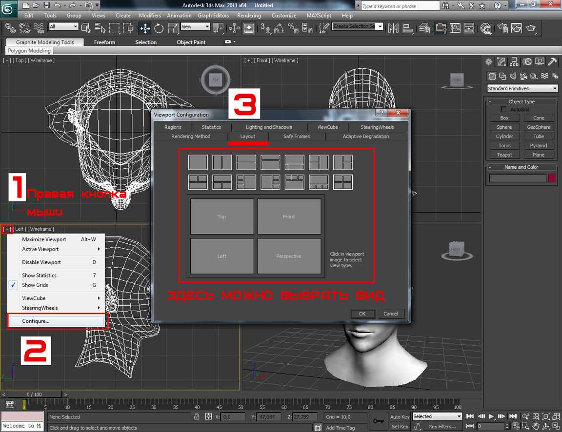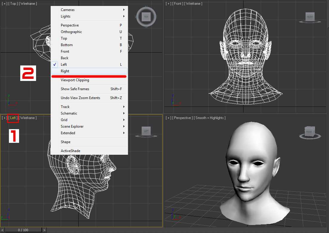 Объекты в 3d редакторе можно представить в трех проекциях. Спереди, сверху и сбоку. В 3D Max окна проекций похожи на чертежи. При первом запуске программы обычно представлено четыре окна: в верхнем левом расположен вид Top (вид сверху), далее правое верхнее окно Front (Вид спереди), нижнее левое Left (Вид слева) и в четвертом окне представлен вид Perspective (Перспектива).