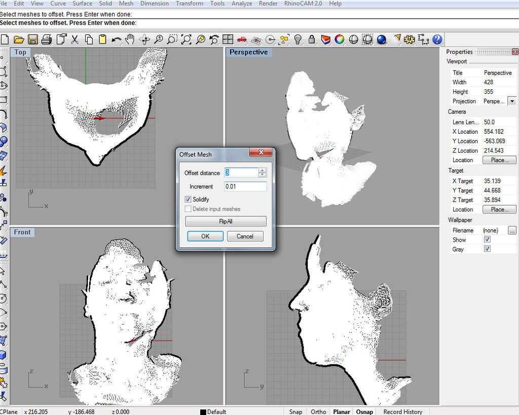 Если ваше сканирование неполное (то есть сделано только под одним углом), вам нужно будет добавить толщину к поверхности, чтобы преобразовать ее в твердотельную модель. Я импортировал файл obj в Rhino, проверил, что размер объекта был правильным, и использовал команду OffsetMesh, чтобы сгущать сканирование до 3 мм. Убедитесь, что установлен флажок «Solidify» — таким образом, Rhino заполнит ребро между двумя поверхностями, чтобы создать сплошной объект-сетку.