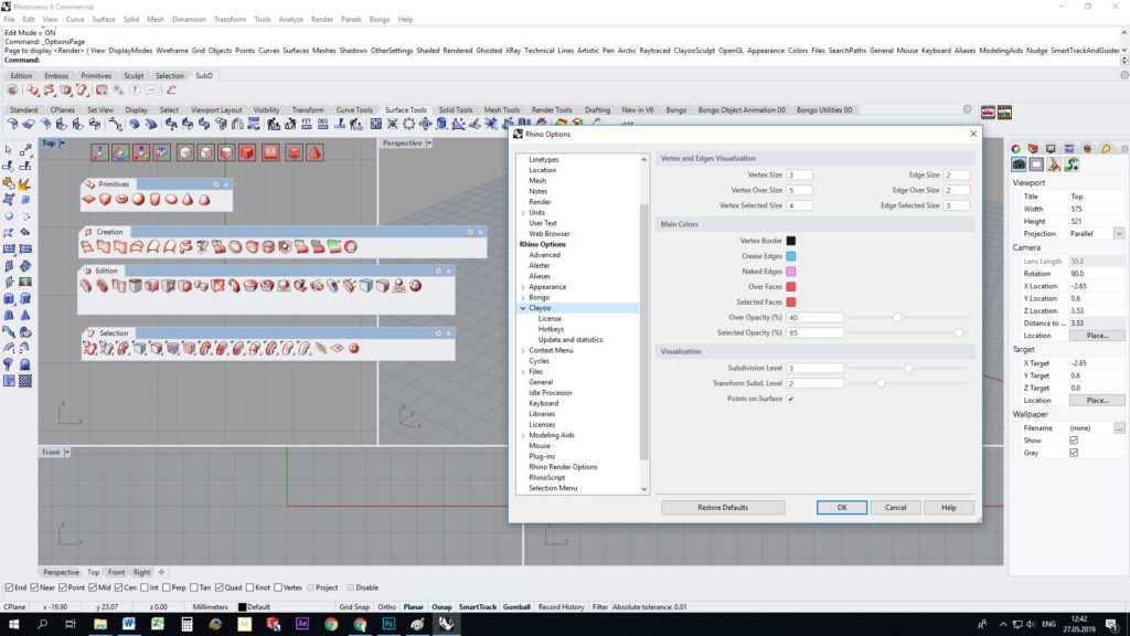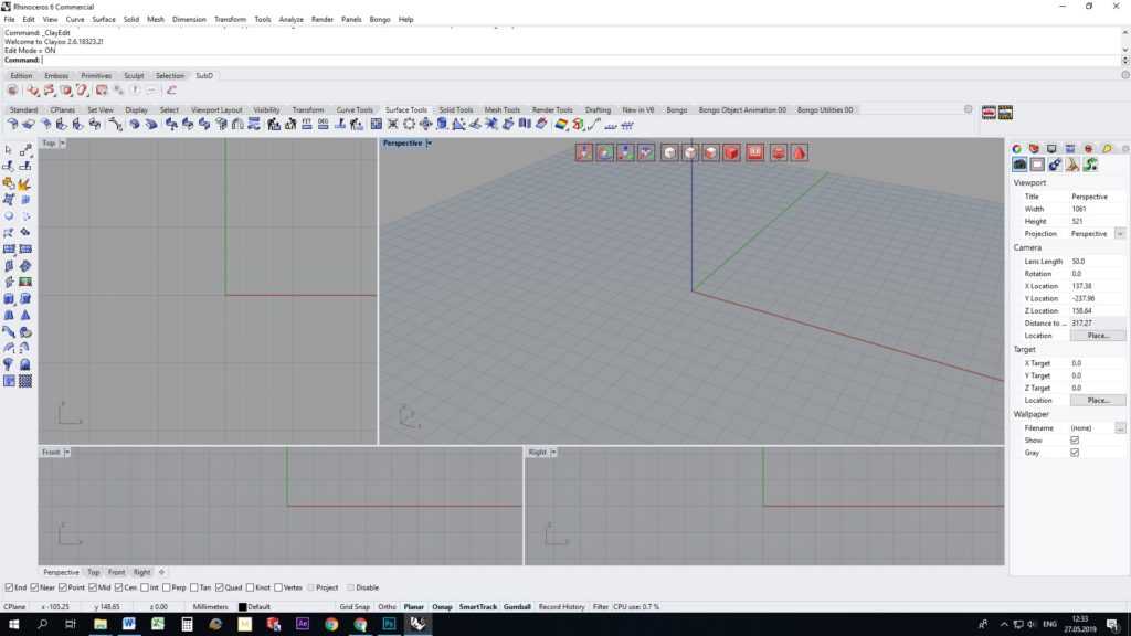 Запуск установленного плагина осуществляется из окна Rhino путем активации Edit Mode.Активное окно в режиме работы Clayoo выглядит так: