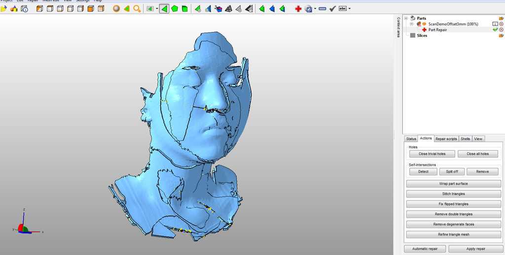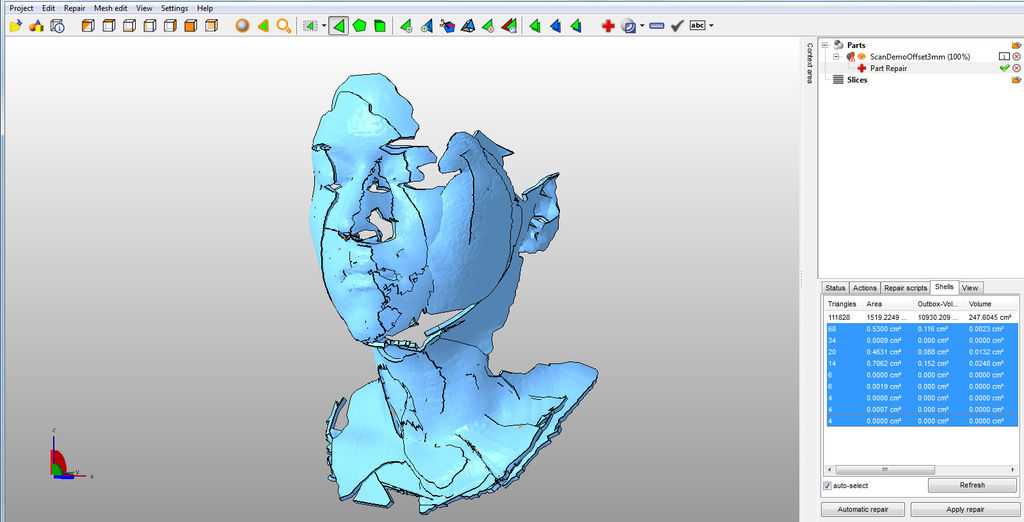 Netfabb запустит все функции восстановления, если вы нажмете «Автоматическое восстановление». Но по моему опыту, попытка закрыть отверстия до того, как края будут сшиты, приводит к искажению модели, поскольку Netfabb пытается соединить открытые края на одной стороне модели с открытыми краями на другой стороне. По моему опыту, гораздо безопаснее запускать функции первоначального восстановления по отдельности при первом импорте файла.