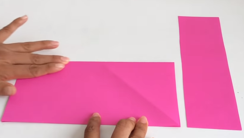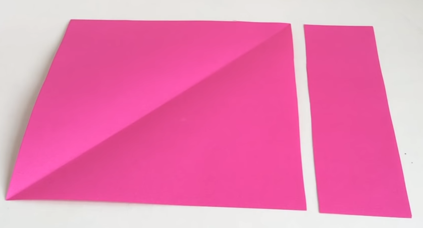 Возьмем альбомный лист бумаги (цветную) можно просто белую. И сделаем треугольничек, не нужную часть отрезаем.