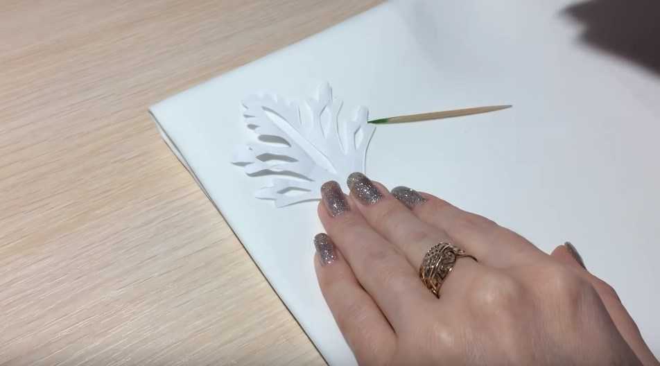 С обратной стороны лишнюю бумагу можно подклеить или оставить ее без изменений, чтобы снежинка стала пышнее. Края лучиков обработайте корректором или белым маркером, чтобы создать имитацию снега.