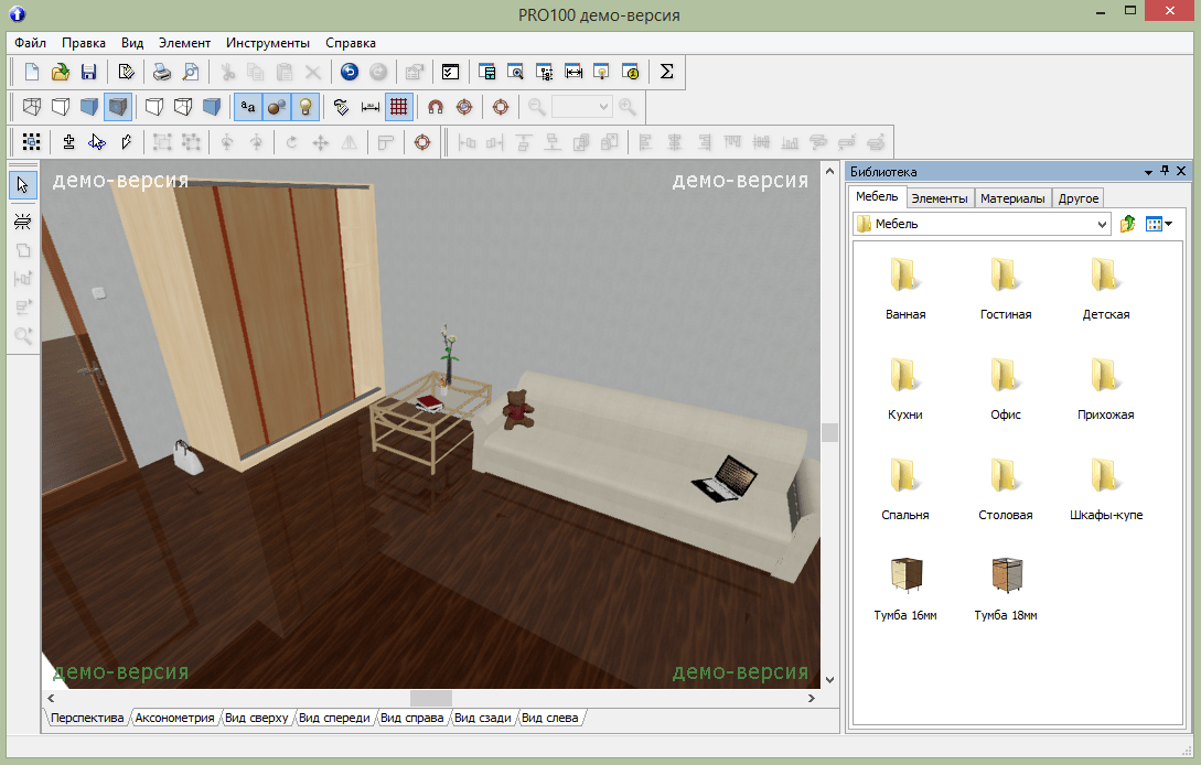 Здесь вы найдете все необходимые инструменты, а также множество разнообразных библиотек: ящики, двери, крепления, фурнитура, материалы и другие. Также вы можете создавать собственные библиотеки, но, к сожалению, это доступно лишь в полной версии.