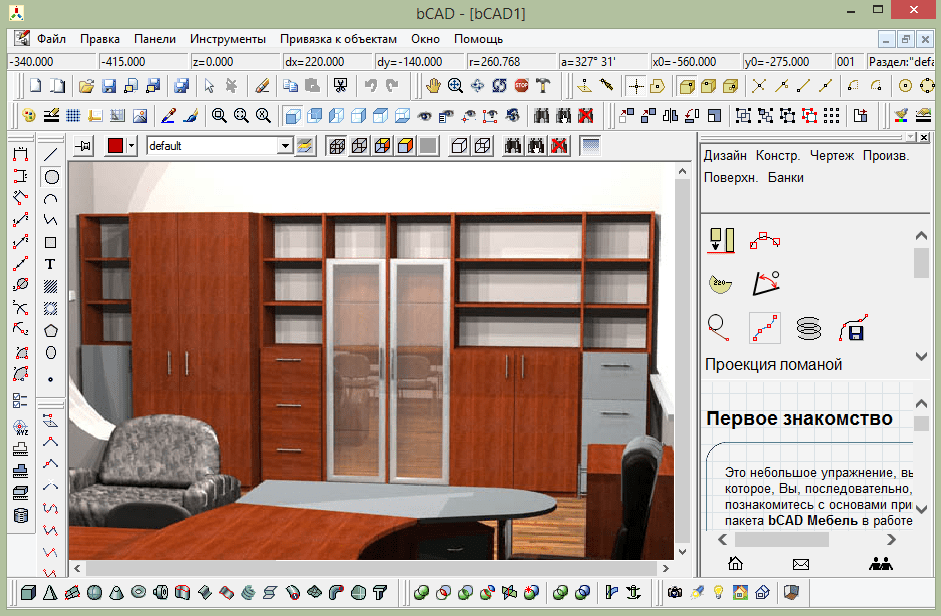 Программа легкая в освоении, во время работы она будет подсказывать вам, если у вас возникнут трудности. Также bCAD работает в полуавтоматическом режиме. Это значит, что большую часть рутинной работы данная система выполняет за вас: расстановка крепежей, построение чертежей и карт раскроя, подгон габаритов… Но в тоже время вы можете вмешаться в работу программы и внести свои коррективы. Мощные средства визуализации позволяют создавать точные чертежи и фотореалистичные объемные изображения с помощью OpenGL. Благодаря этому вы заранее можете увидеть и продемонстрировать проект заказчику.