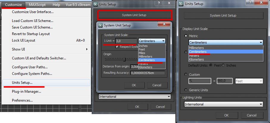 Сначала изменим системные настройки. В 3d max есть своя мера длинны — unit.