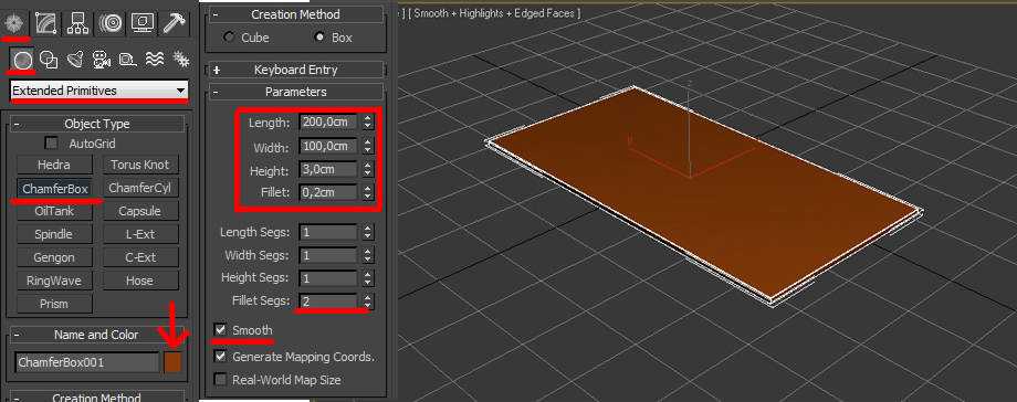 вместо Standart Primitives далее жмем на ChamferBox и создаем его в окне перспективы. Задаем параметры:Length 200cm; Width 100cm; Height 3cm; Fillet (фаска) 0,2cm. Цвет выбираем коричневый.