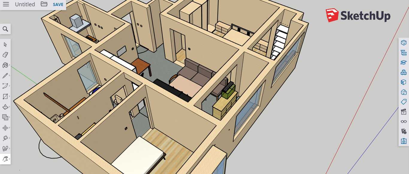 Программа для 3D-дизайна и архитектурного проектирования подойдет более продвинутым пользователям, поэтому рекомендуем запастись несколькими днями для знакомства со SketchUp и при необходимости посмотреть обучающие видео. С помощью этого программного обеспечения в режиме онлайн можно моделировать жилые дома, мебель, интерьер, а также заниматься более сложными вещами: проектировать лестницы, электропроводки, санитарно-технические коммуникации и даже создавать модели улиц или целых городов.