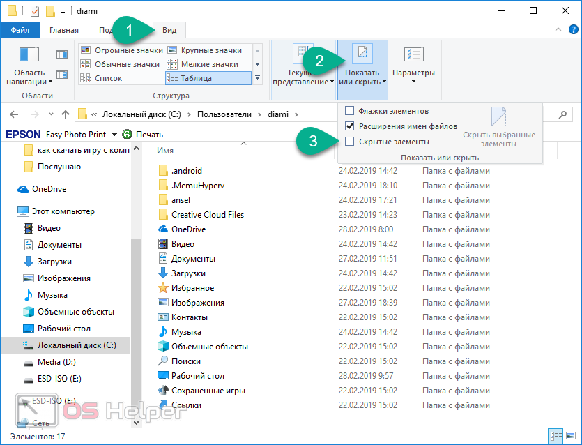 - Открываем вкладку «Вид», жмем кнопку, о, и включаем отображение скрытых элементов.
