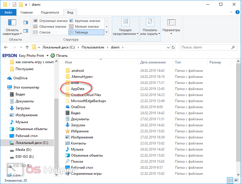 - Открываем отмеченный на рисунке каталог. Как видите, его значок немного затемнен. Это значит, что перед вами скрытый системный каталог. Если бы мы не поставили галочку его отображения, найти папку было бы невозможно.