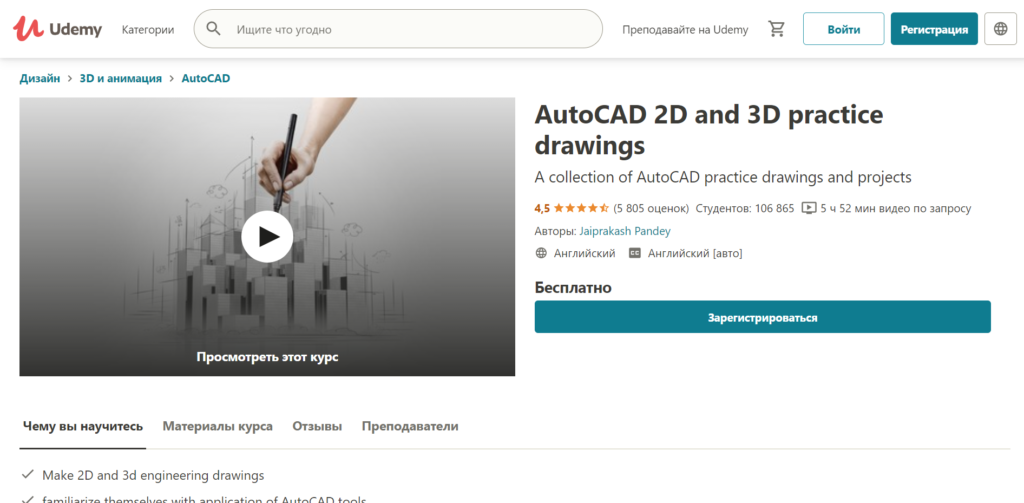 После прохождения этого курса можно задуматься о более серьёзном, платном материале. Эти же уроки подойдут тем, кто хорошо знает английский и хочет за короткий срок научиться проектировать чертежи в популярной программе. Отсутствие перевода на русский язык — существенный недостаток, который не перекрывает даже наличие большого количество бесплатного материала.