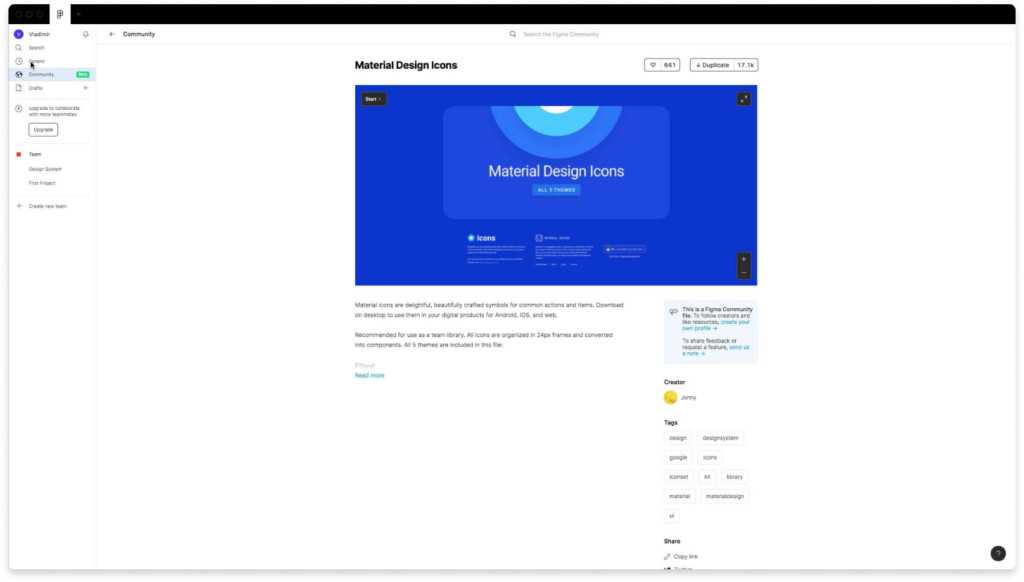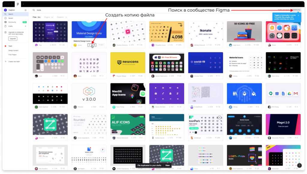 Если вы введете в поисковую строку какой-либо запрос (например Icons), то по умолчанию поиск осуществляется по вашим проектам. Если перейдете во вкладку Commynity (сверху справа или кнопка внизу), то увидите файлы, которыми делятся другие пользователи. Чтобы скопировать файл и редактировать его, нажмите на специальную иконку со стрелкой вниз.
