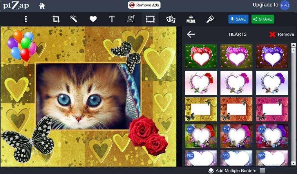 piZap содержит большие наборы рамок и украшений для монтажа умилительных коллажей. Все элементы можно свободно перемещать, поворачивать, изменять их размеры. Бесплатно доступна только часть инструментов, для работы со всем каталогом надо покупать версию Pro. Предварительно оценить ее возможности без оплаты предлагают в течение 7-дневного Trial периода. Интерфейс англоязычный.