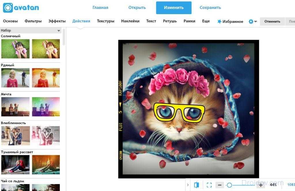 По адресу https://avatan.ru/ расположен бесплатный фотошоп Аватан. Также можно скачать версии для iPhone и устройств на Android. Приложение содержит наклейки, рамки, текстуры, инструменты ретуширования и создания коллажей. Можно добавлять свои рамки или украшения. Интерфейс полностью на русском языке, все действия разнесены на удобные понятные группы.
