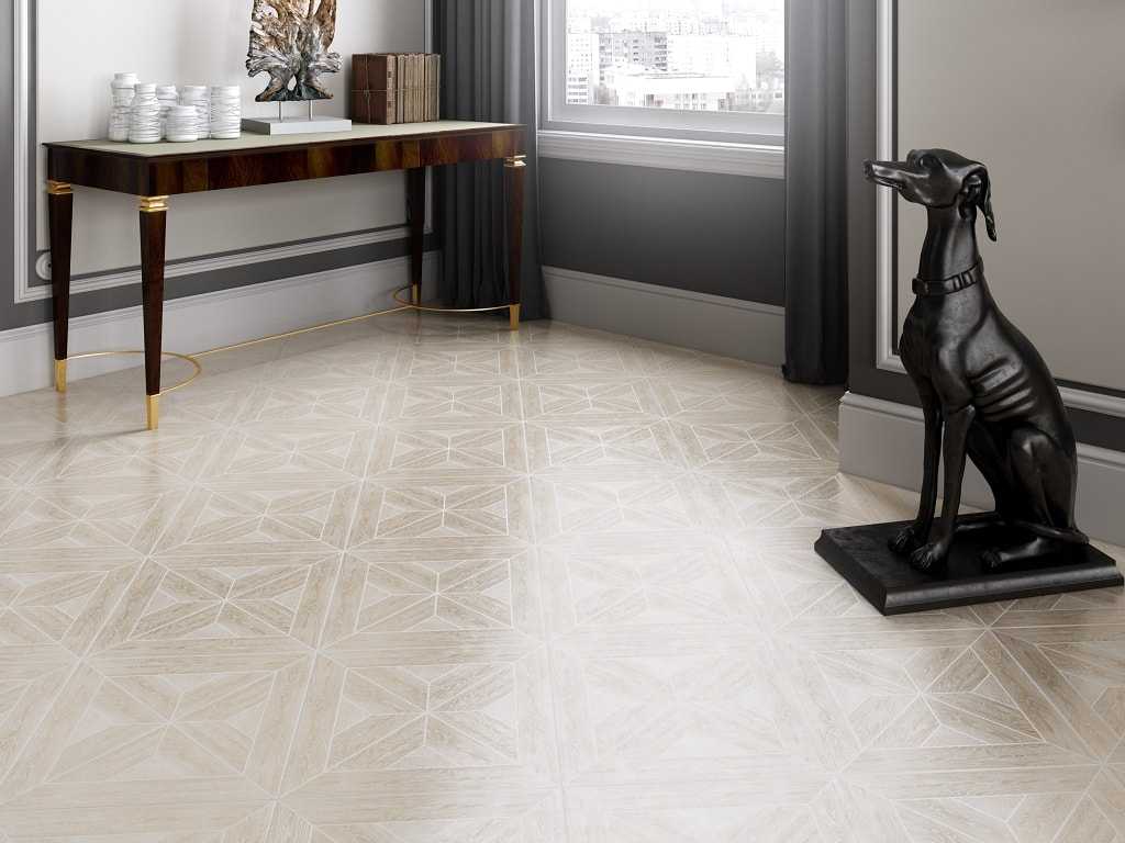 Абстракция в расцветках пола подходит для формирования правильного визуального акцента к мебели или светильникам.