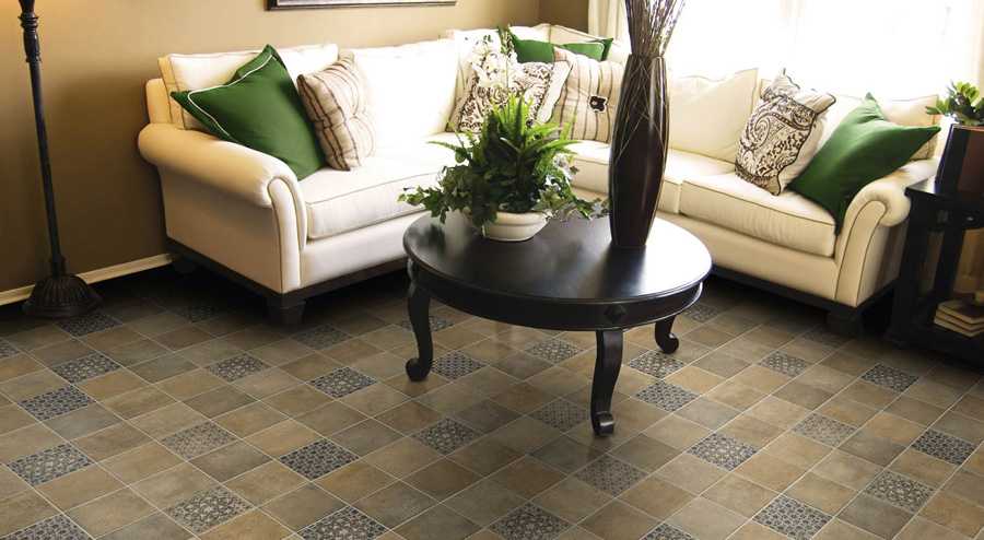 Интересный дизайнерский ход заключается в соединении цветов и оттенков предметов интерьера и самого линолеума. Например, напольная ваза в цвет покрытия будет отличным соединительным элементом.