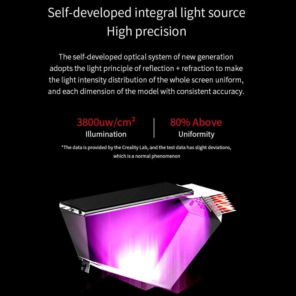 NEW Light Source Structure: 120W Power Super spotlight. The self-developed integral light source, Precision light control High agility slicing, Creality New Slicing System: A Simplified user interface and Easy Modeling function, and supports the parameter customized High-stability Z-axis for high-quality printing. WIFI-APP intelligent control. Supports Creality Cloud. OTA online upgrade: New Firmware/new system. one-click upgrade. Get better experience in firmware upgrade Smart Operation System -Linux: 64-bit 4-core CPU+GPU Mainboard supports the faster operation and greatly improves printing efficiency. Great Operation Experience: Linux System For a better AI Experience, a 5-inch high definition colorful touch screen keep easy works.
