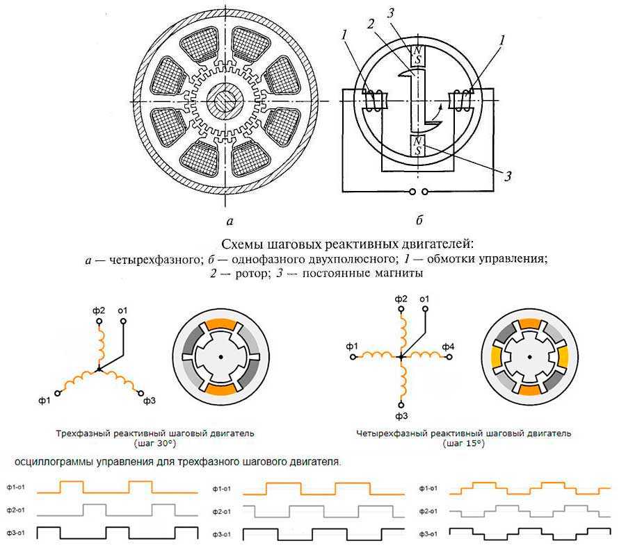 Весомым плюсом такой конструкции шагового привода является отсутствие стопорящего момента, образуемого полем по отношению к арматуре. По факту это тот же синхронный двигатель, в котором поворот ротора идет в соответствии с полем статора. Недостатком является снижение величины вращающего момента. Шаг для реактивного двигателя колеблется от 5 до 15°.