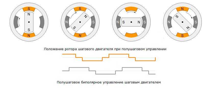 Полушаговый – представляет собой комбинацию двух предыдущих методов коммутации обмоток. Во время реализации которого в шаговом двигателе происходит поочередная подача напряжения сначала в одну катушку, а затем сразу в две. Благодаря чему обеспечивается лучшая фиксация на максимальных скоростях и большее количество шагов.