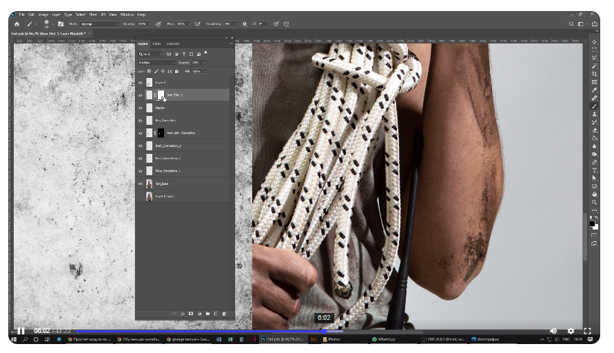 Очень и очень кропотливая работа с масками и слоями с каждым элементом изображения — от грязных пятен на лице до теней от листочков на переднем плане. Все это, опять таки, можно повторить самостоятельно, потому что процесс показан от и до.