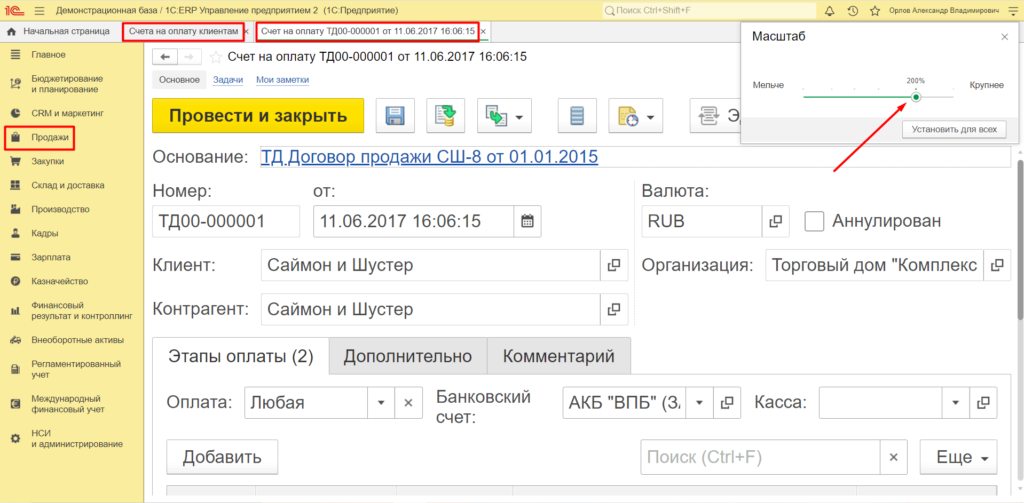 Для того, чтобы увеличить шрифт только для одной формы документа следует выбрать необходимую группу документов. Допустим, счета на оплату. В меню Продажи нужно кликнуть в разделе Оптовые продажи на категорию Счета на оплату. В открывшемся окне со списком счетов или в окне формы конкретного документа в правом верхнем углу нажать на 3 точки. В выпадающем меню выбрать Изменить масштаб. Перевести бегунок на необходимый процент.