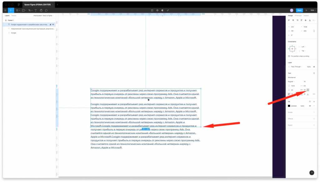 При выставлении иконки «Fixed size» будет фиксированная высота и ширина текстового фрейма. Если вы будете добавлять новые предложения, то текст будет заходить за его границы.