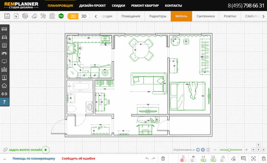 - большая библиотека мебели с возможностью настраивать ее параметры и дизайн;
