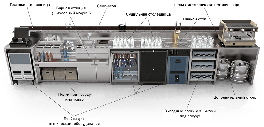 - Сборка. Модульные стойки здорово подходят для выставок и уличных кафе. Благодаря свободной компоновке отдельных элементов, такие конструкции легко встраиваются практически в любое пространство. Стандартные барные стойки изготавливаются на заказ и представляют собой стационарные элементы интерьера, обеспечивающие максимально комфортные условия и посетителям, и бармену.