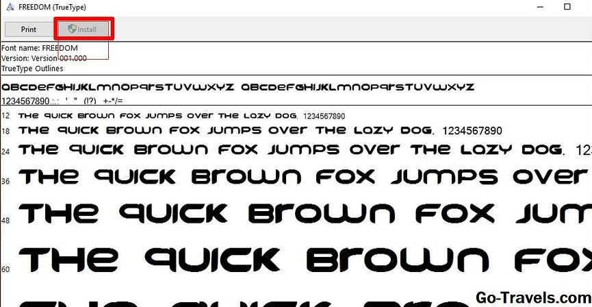 Как только шрифт находится в правильной папке, он должен установить автоматически. Если это не так, дважды щелкните файл шрифта, чтобы открыть предварительный просмотр шрифтов, и нажмите кнопку «Установить» в верхнем левом углу. При следующем открытии Word новый шрифт должен появиться как опция в списке шрифтов.