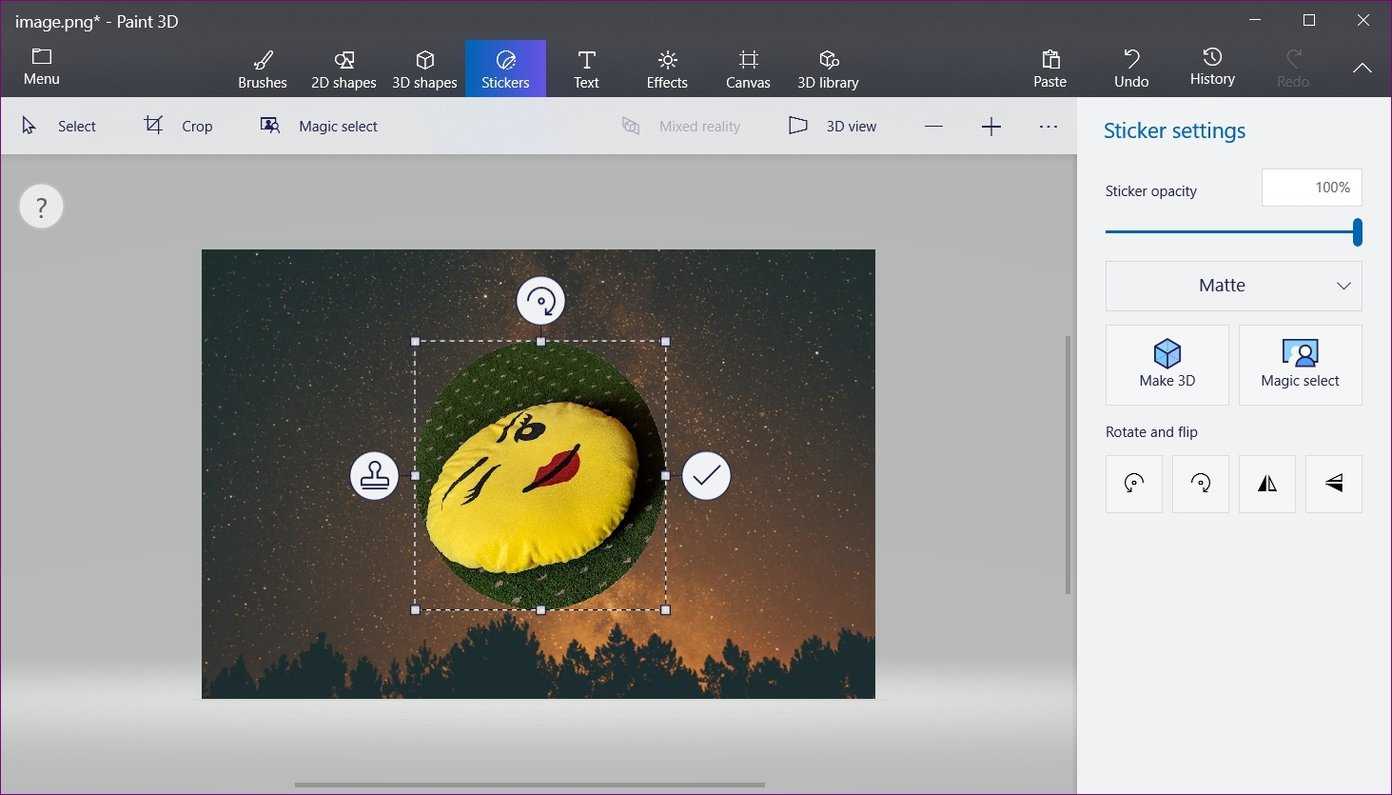 Если вы хотите добавить это недавно созданное круглое изображение поверх другого изображения в самой программе Paint 3D, вы можете сохранить его как наклейку. Для этого, когда вы завершите шаг 1 процесса удаления фона (т. Е. Используйте инструмент выбора Magic), нажмите на изображение. Нажмите Сделать стикер на боковой панели.
