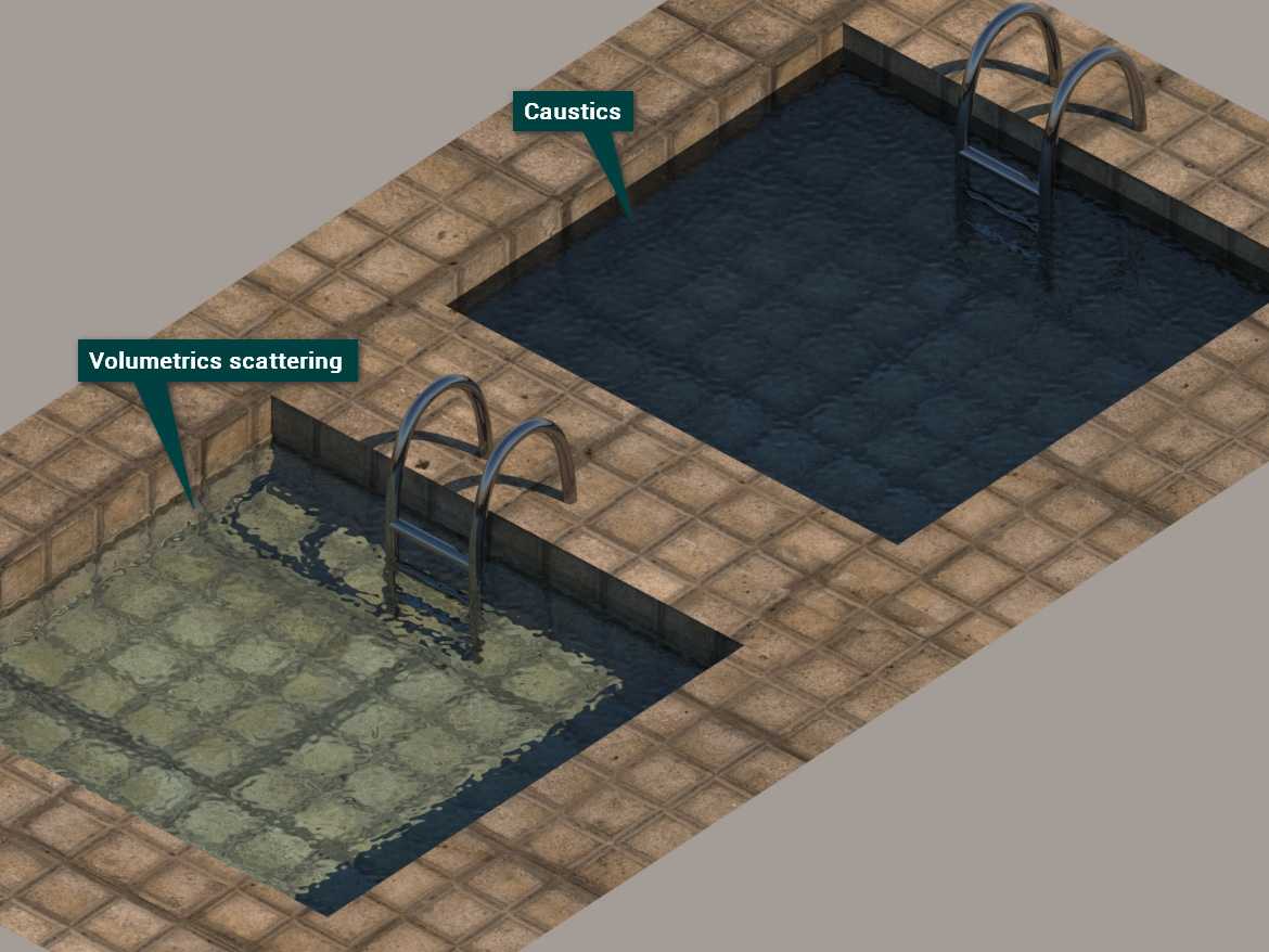 Установка флажка Caustics включает физически корректный расчет каустики для всего, что имеет прозрачность. Настраивать каустику практически нельзя. Более того, изменение параметров типа Volumetrics scattering или Refraction Color могут практически не влиять на материал.