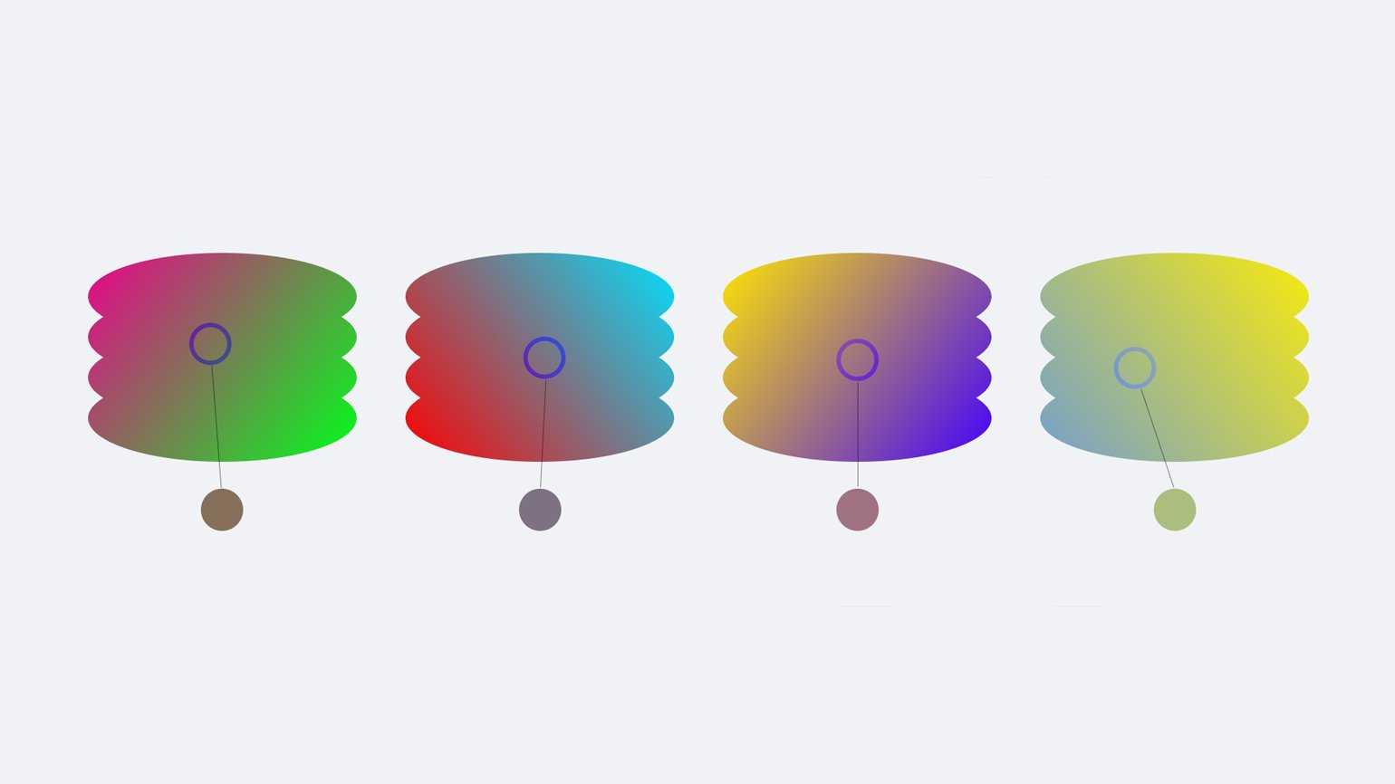 В левом окне положение точки влияет на то, с какой силой она будет распространять цвет: чем ближе точка к углу, тем больше её цвета будет на градиенте в правой части. Положение точек в правом окне влияет на взаимодействие цветов друг с другом: чем точки ближе, тем переход более резкий, чем дальше — тем более плавный.