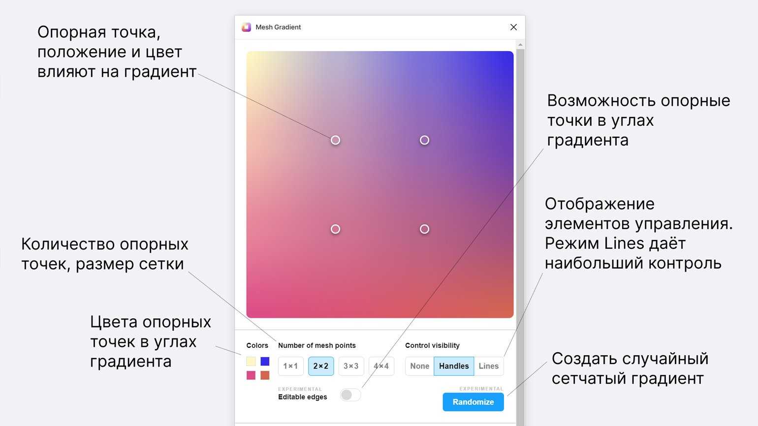 Рассмотрим интерфейс плагина. В нём можно настроить размер сетки, цвета из углов градиента, отображение элементов управления, а также управление опорными точками mesh-градиента. Для ленивых сделана кнопка Randomize, которая создаёт случайный сетчатый градиент.