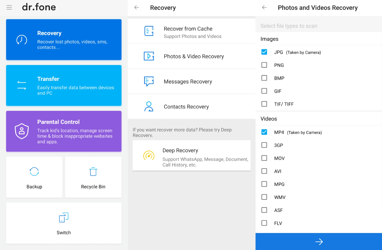 Помимо фотографий (JPG, PNG, BMP, GIF), контактов и сообщений здесь можно восстановить из кэша видео множества популярных форматов: MP4, 3GP, AVI, MOV и других. Dr.fone умеет извлекать данные из кэша, поэтому root-права необязательны. Чтобы проверить эффективность приложения, я удалил несколько видео перед его установкой. Оно смогло восстановить 9 из 10. Неидеально, но на мой взгляд, весьма неплохо.