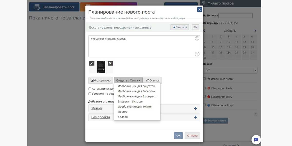 SMM-специалисты, пользующиеся сервисом отложенного постинга SMMplanner, могут работать с Канвой прямо внутри планировщика. Это одна из интегрированных функций сервиса автопостинга – с помощью редактора можно создавать креативы для соцсетей при планировании поста, используя различные эффекты и шаблоны.