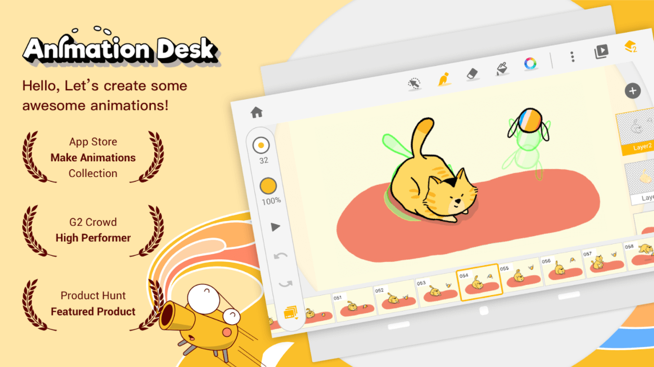 В Animation Desk можно добавить анимацию к изображениям, видео, слоям PSD или нарисовать все покадрово с нуля. Здесь есть все базовые инструменты, в том числе набор из 46 кистей и шрифтов, инструкция по раскадровке и красивые штампы, а также несколько карандашей с регулируемой толщиной и прозрачностью линии.