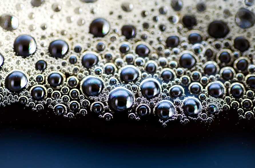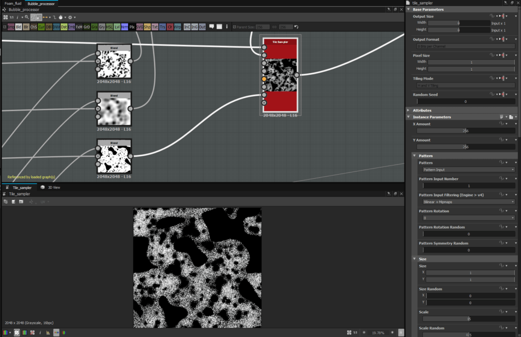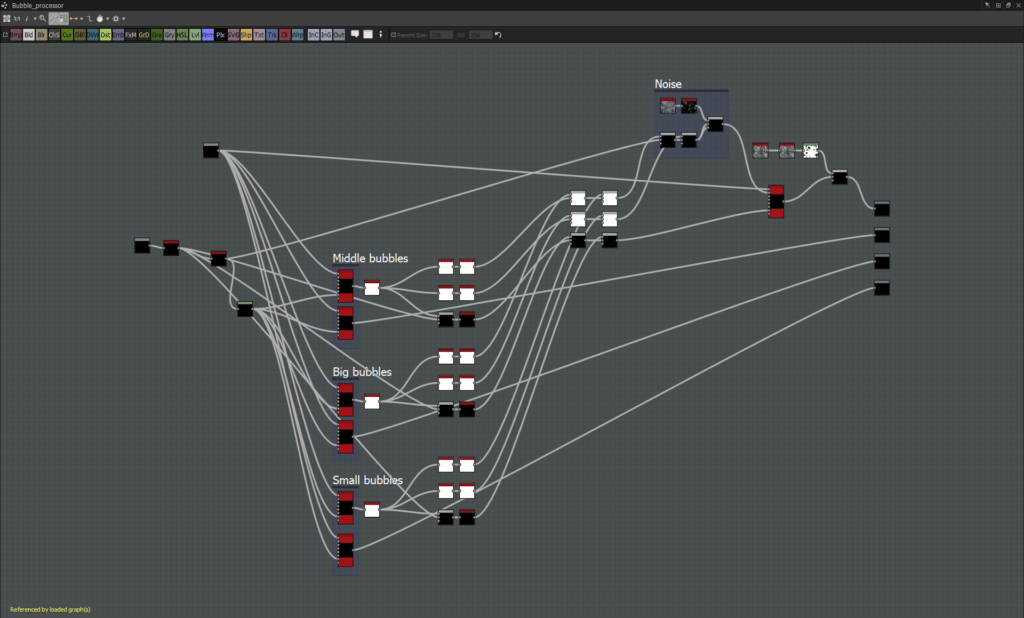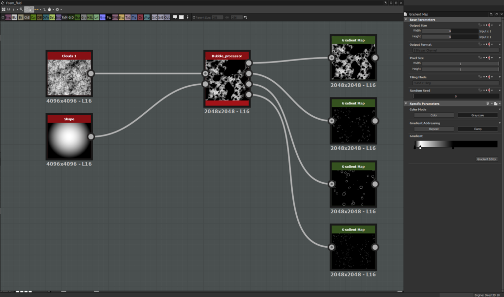 На выходах получил несколько типов пузырьков с контурами, созданными с помощью инструмента Карта градиента (Gradient map node), и толстый слой пены из маленьких пузырьков.