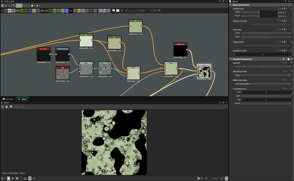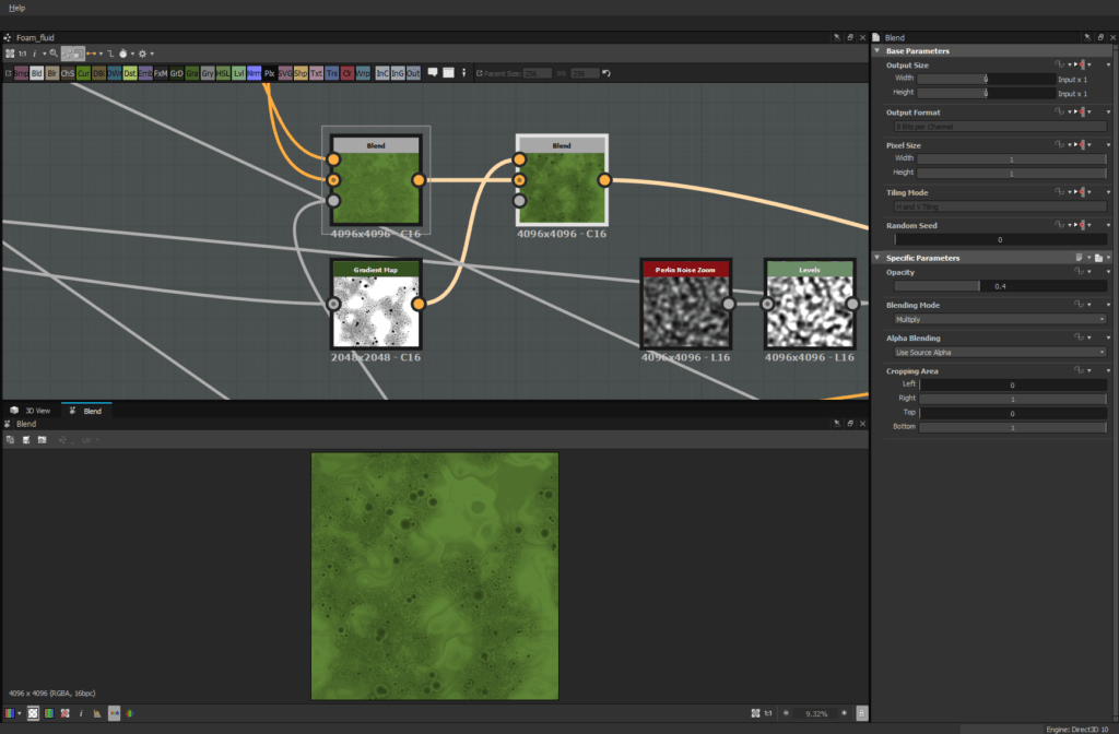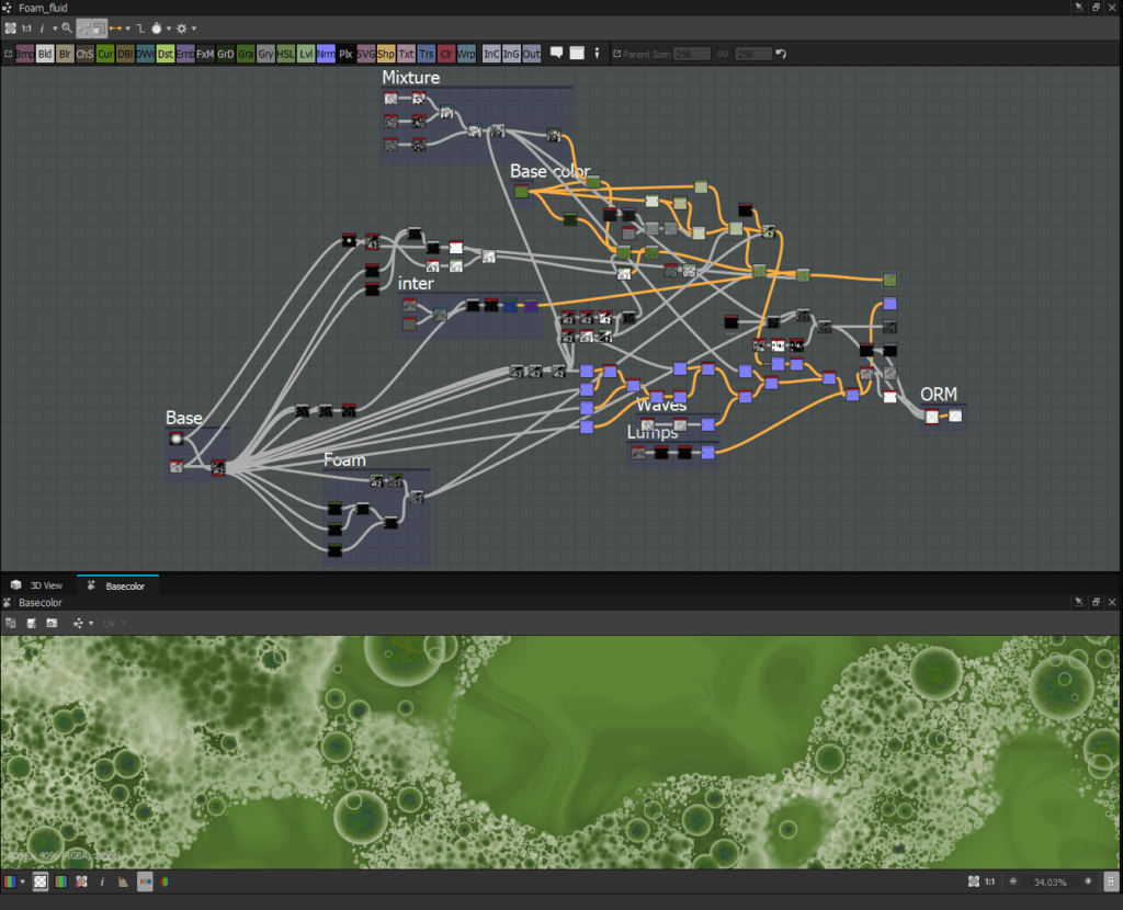 Маска, взятая из генератора пены, используется при формировке нормалей, цвета пены, альбедо, отделении пены от слизи. Еще я добавил эффект тени внутри пузырьков, чтобы пена выглядела «глубже», смешал базовый цвет слизи и инвертированную маску наложения с помощью Режима умножения и у меня получился такой легкий затенение внутри пузырьков.