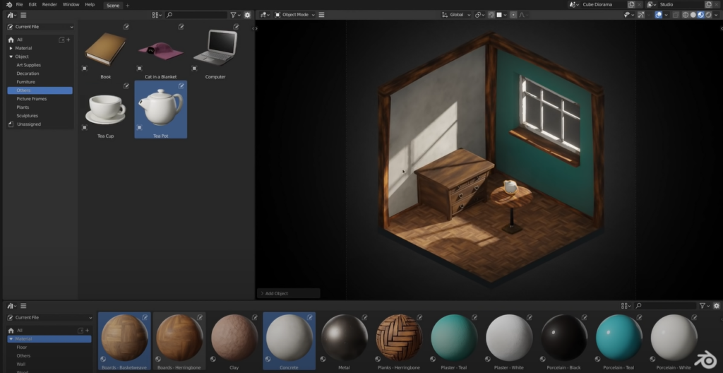 Материал стекла обладает тремя основными свойствами. Это прозрачность, отражение и преломления света. Все эти свойства сложно показать, не создав хоть какого-нибудь окружения. Поэтому, мы начнем с того, что сделаем не большое окружение.