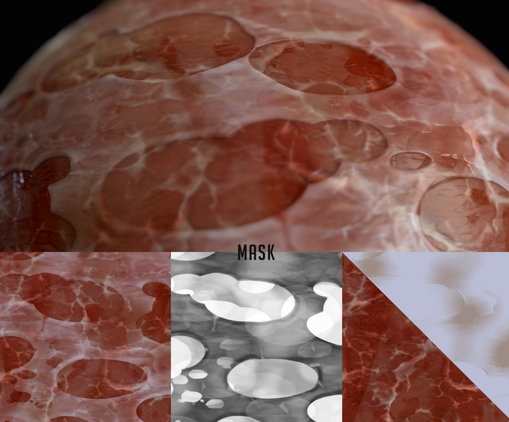 На изображении высокого разрешения видно подкожный слой и оболочку мяса. Слева видно альбедо поверхности, которое создавалось наложением двух материалов. Заметны потемнения по краям неравномерного слоя маски, сымитировано утолщение оболочки, как если бы на месте деформации было повреждение оболочки.