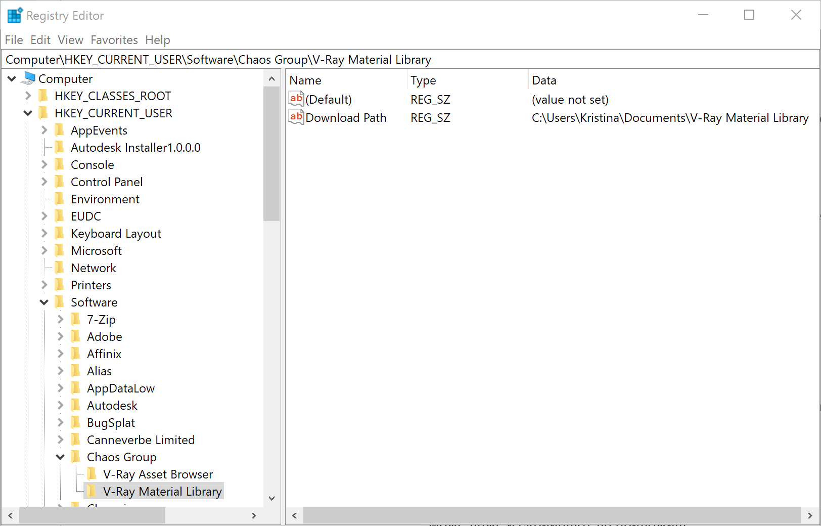 If none of the above is set, the downloader uses the last download location stored in the registry. Navigate to «HKCU\Software\Chaos Group\V-Ray Material Library», REG_SZ key «Download Path». The «Download Path» key is created or updated after successful material library download.