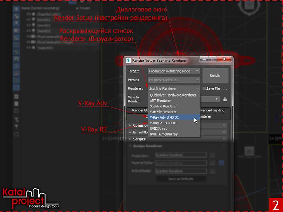 - Загружайте вашу сцену и смените рендерер на VRayRT.